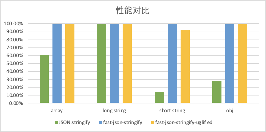 在一些性能敏感的场合下(例如服务端处理大量并发),或面对大量 stringify 的操作时,我们会希望它的性能更好,速度更快。这也催生了一些优化的 stringify 方案/库,下图是它们与原生方法的性能对比: