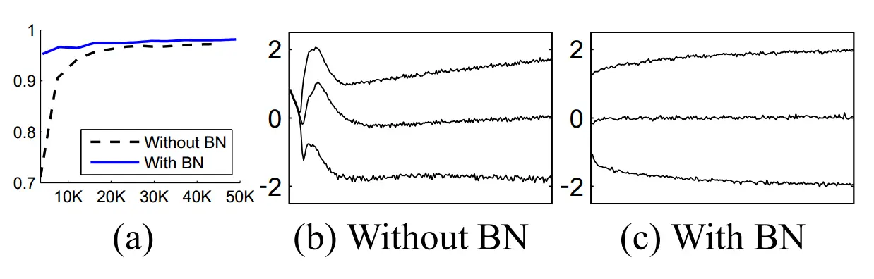 随着训练的不断进行,数据的分布保持不变对训练是有利的,使用BN前后对训练的影响可以对照下图