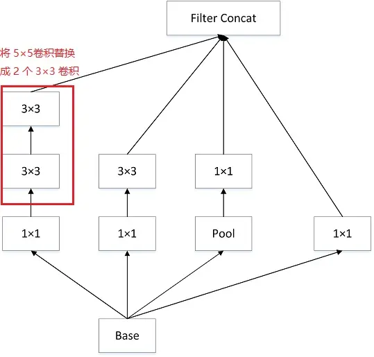 将 BN 运用到 GoogLeNet 网络上,同时将 Inception 模块中的 5×5 卷积替换成 2 个 3×3 卷积,将 5x5 卷积分解为两个 3x3 卷积运算,以提高计算速度。虽然这看似违反直觉,但 5x5 卷积比 3x3 卷积多 2.78 倍的参数量。因此,堆叠两个 3x3 卷积实际上可以提高性能。