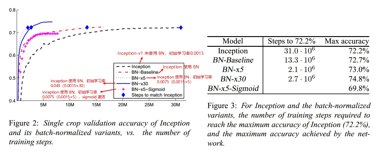 在数据集 ILSVRC 上,使用 BN 技术并设计使用不同参数的 Inception 的网络,对比其精度,结果如下:使用 BN 技术,可以显著提高训练速度;对比 BN-×5 和 BN-×30,可以观察到,使用大的学习率可以提高训练速度。