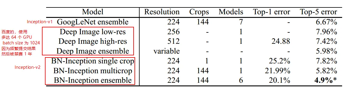 题外话:BN-Inception 在 ILSVRC 竞赛数据集上分类错误率是 4.8%,但是该结果并没有提交给 ILSVRC 官方。