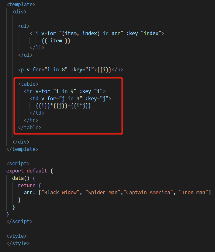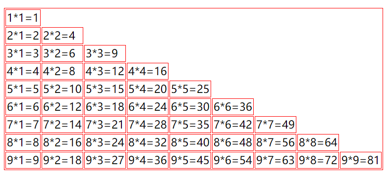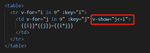 用v-show改进一下再写个样式就是小时候文具盒中常见的三角九九乘法表: