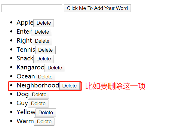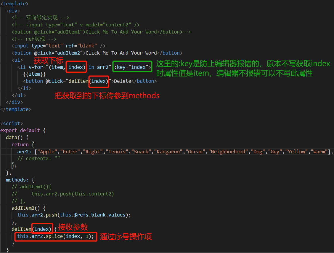 在不需要用到下标的情况下v-for指令常常会被简写为 v-for="item in arr" 或 v-for="i in arr",但用到下标的情况也很多,比如一下案例需要删除列表中的某一项,运用下标来实现是最简单方便的: