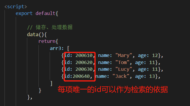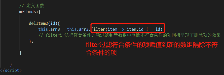 上面用到了splice通过数组中每一项的下标index来删除数组中的项,如果需要通过检索特定数据删除,就需要用到另一种方法————filter()函数过滤。filter()函数底层有遍历可以达到隔除不符合条件的项的效果从而间接实现删除项。比如下面案例的数组中每一项都有一个独一无二的id,通过检索这个id来删除数组中的项: