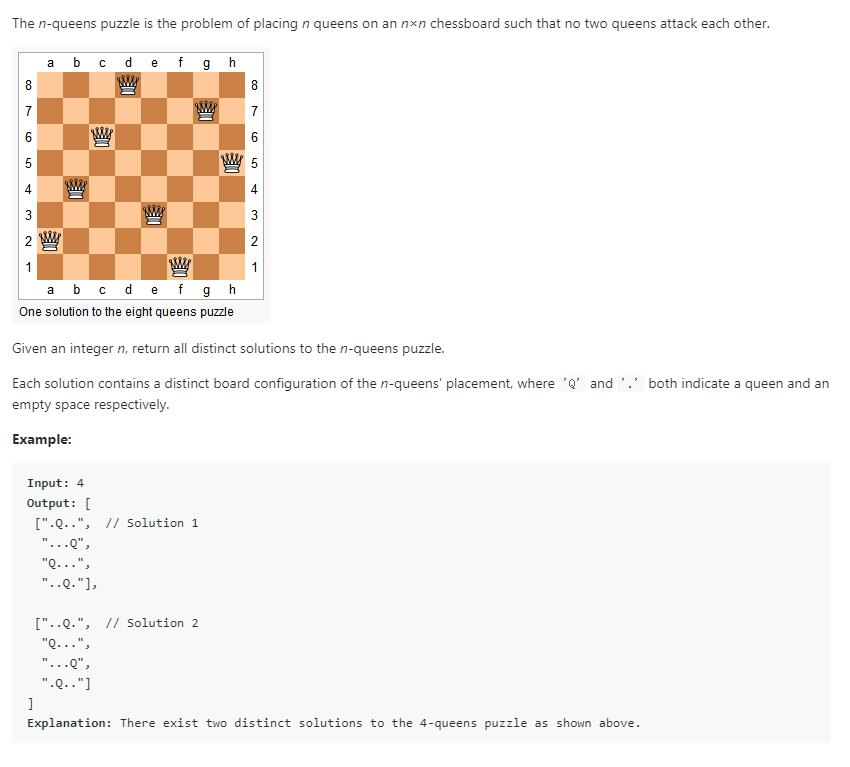 比较经典的回溯问题了,我们需要做的就是先在第一行放一个皇后,然后进入回溯,放下一行皇后的位置,一直走下去,如果已经放的皇后的数目等于 n 了,就加到最后的结果中。然后再回到上一行,变化皇后的位置,然后去找其他的解。