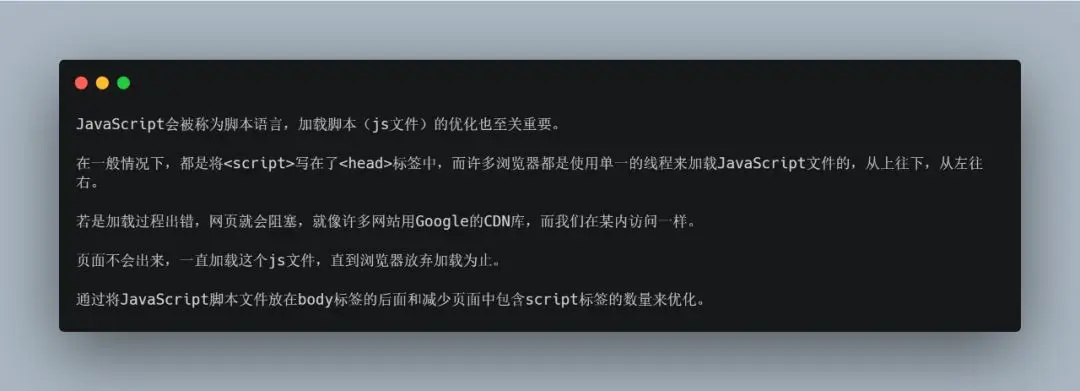 提升文件的加载速度,合并JavaScript代码,尽量少用script标签,无堵塞加载JavaScript,通过给script标签增加defer属性或者是async属性来实现