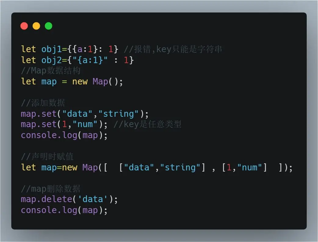 它是对object的一个补充,map的key可以是任意类型,而传统对象的key必须是字符串。