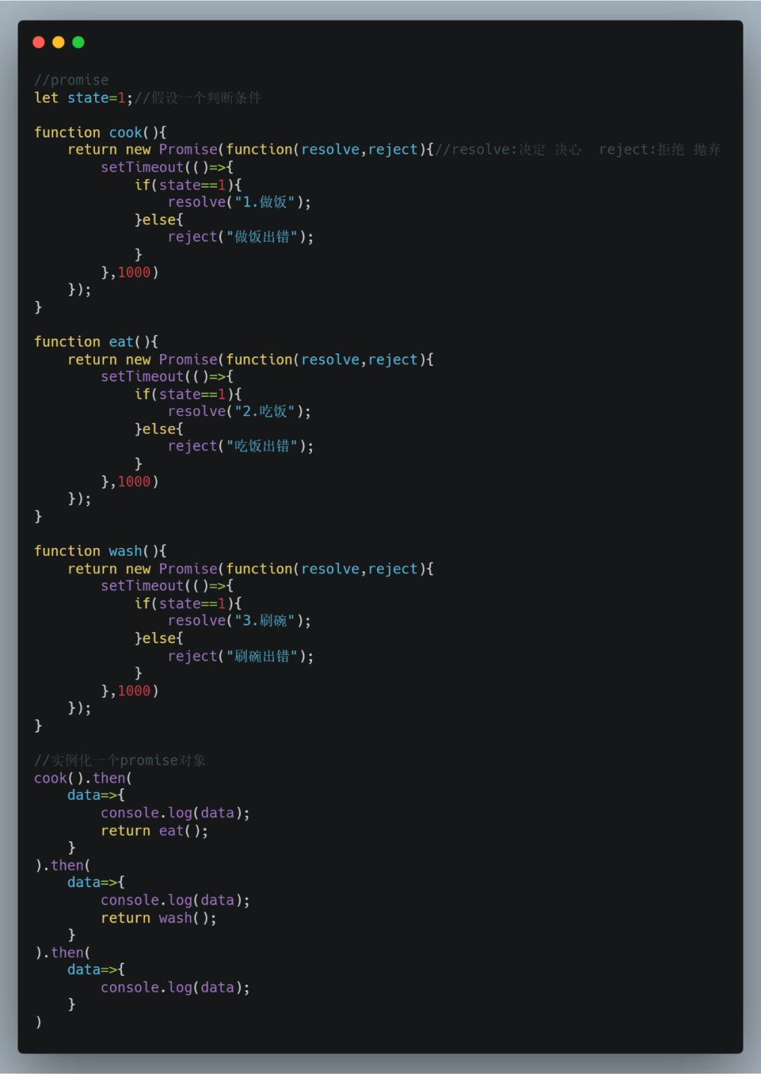 promise对象用于处理异步操作的,异步处理成功了就执行成功的操作,异步处理失败了就捕获错误或者是停止后续操作。