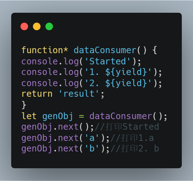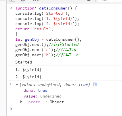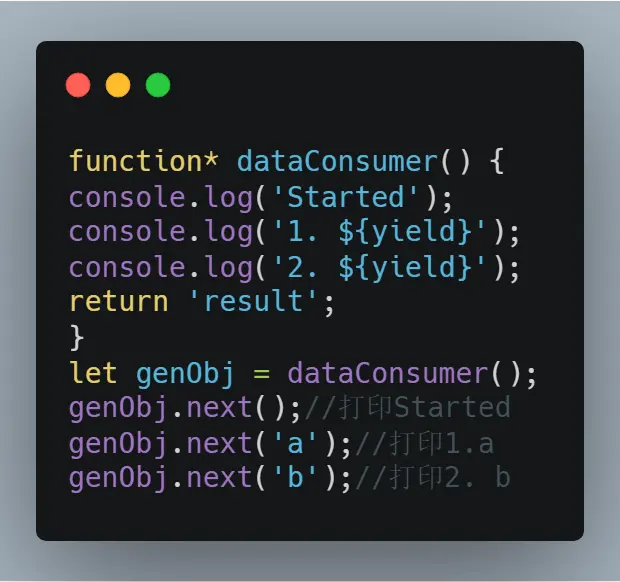 执行函数后,返回的是一个指向内部状态的指针对象,yield表达式是暂停执行的标记,next方法可以恢复执行。