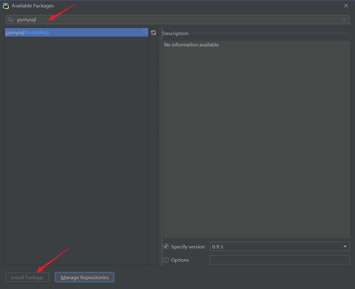 因为 Python2的mysql库为:mysqldb,而Python3的为:pymysql,所以要在 Pycharm 中安装 pymysql 。和之前安装 django 类似,见下图: