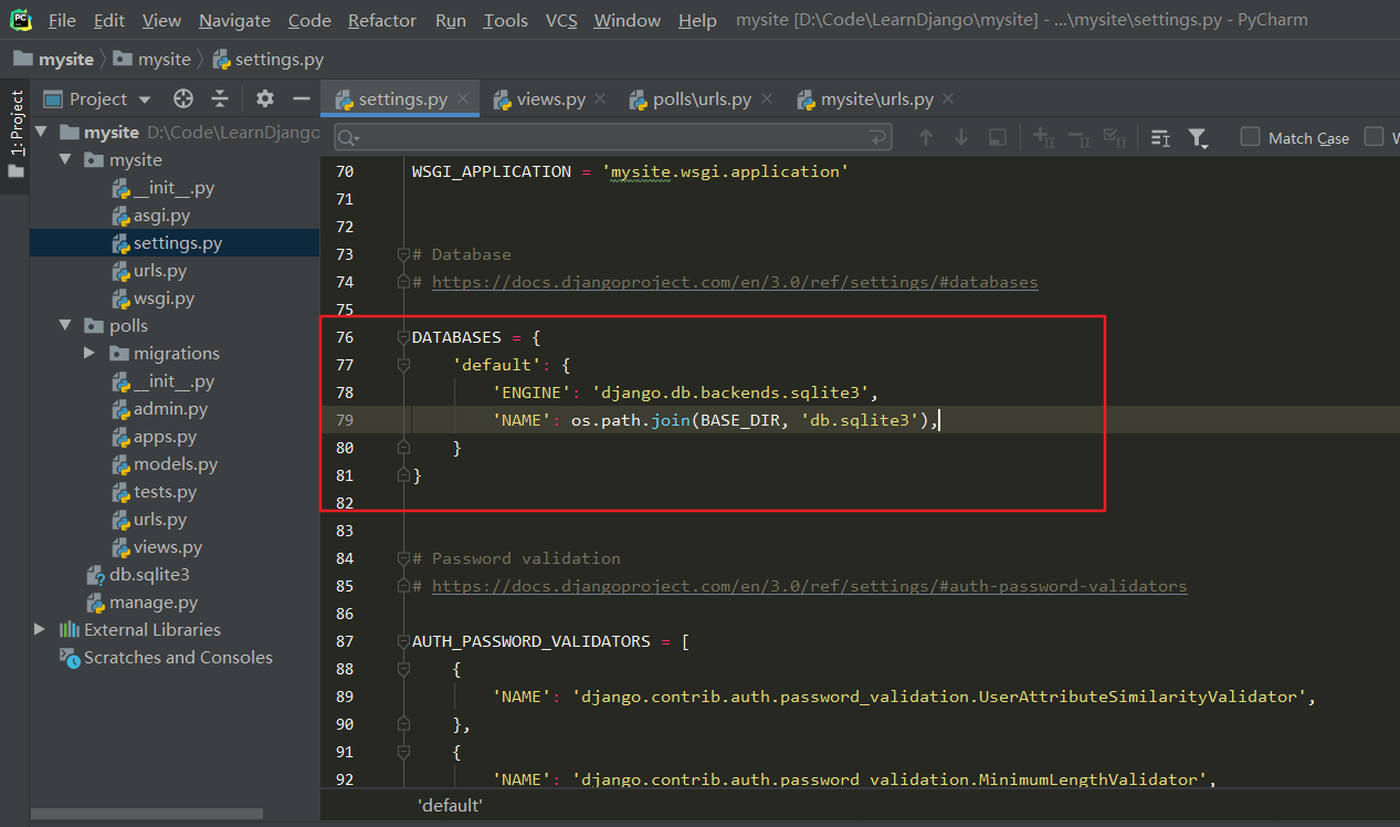 打开 mysite/settings.py,找到 DATABASES ,修改红框里面的内容: