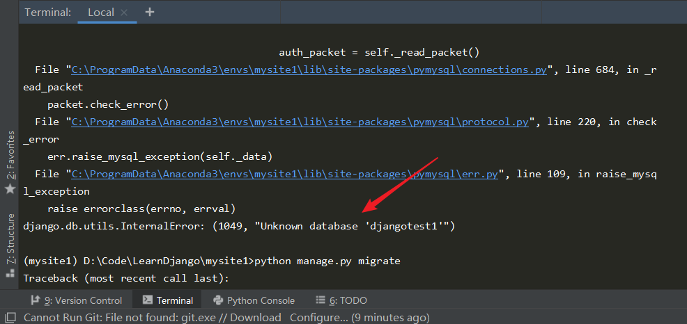 django.db.utils.OperationalError: (1049, "Unknown database 'djangodb'")