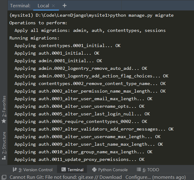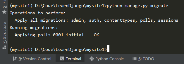 python manage.py makemigrations为模型的改变生成迁移文件。 - 运行