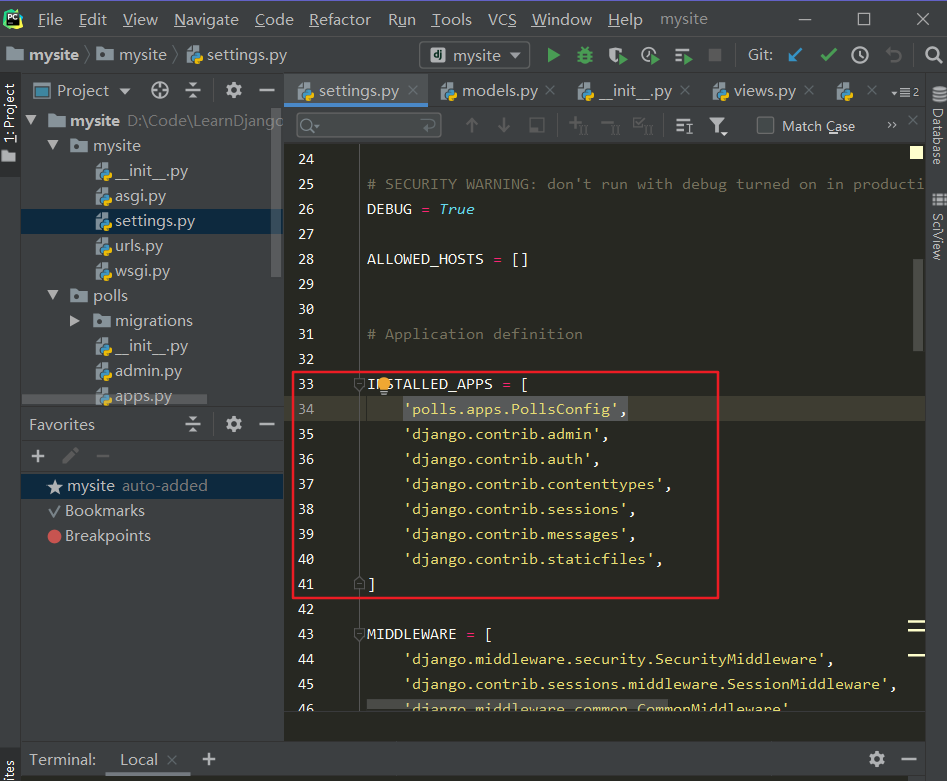 在文件 mysite/settings.py 中 INSTALLED_APPS 子项添加点式路径: