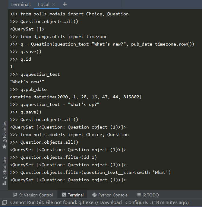 在这个简单的投票应用中,需要创建两个模型:问题 Question 和选项 Choice。Question 模型包括问题描述和发布时间。Choice 模型有两个字段,选项描述和当前得票数。每个选项属于一个问题。