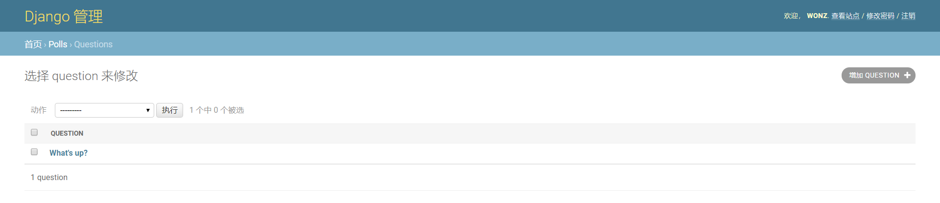 点击 "Questions" 。现在看到是问题 "Questions" 对象的列表 "change list" 。这个界面会显示所有数据库里的问题 Question 对象,你可以选择一个来修改。这里现在有我们在上一部分中创建的 “What's up?” 问题。