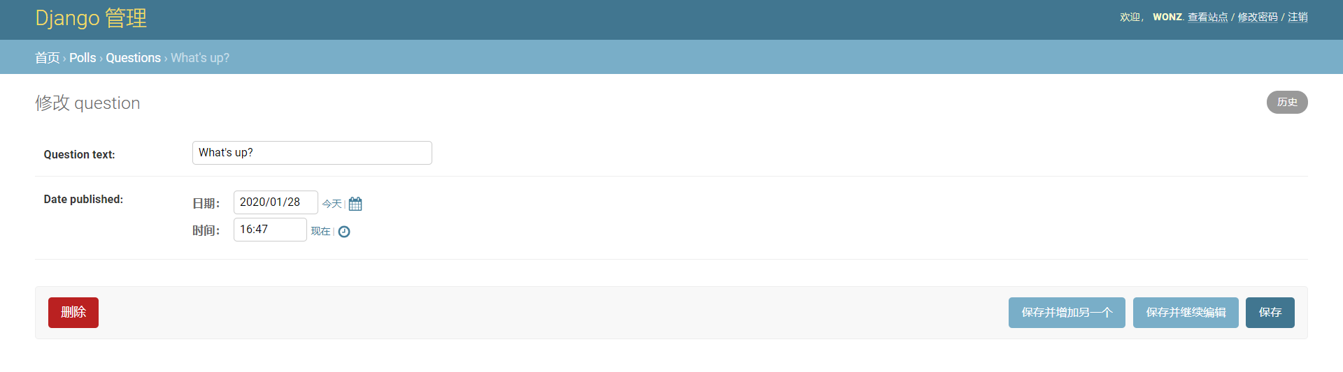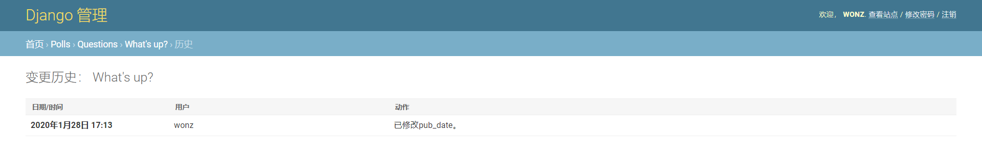 通过点击 “今天(Today)” 和 “现在(Now)” 按钮改变 “发布日期(Date Published)”。然后点击 “保存并继续编辑(Save and add another)”按钮。然后点击右上角的 “历史(History)”按钮。你会看到一个列出了所有通过 Django 管理页面对当前对象进行的改变的页面,其中列出了时间戳和进行修改操作的用户名: