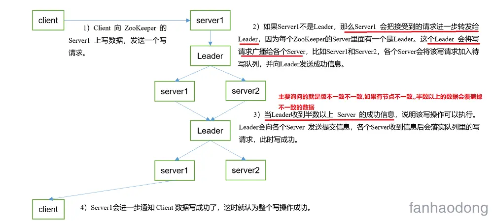 - 当client发送了一条写请求, server接收到写请求,会将请求给leader,leader会同意,此时广播给其他的server,当有半数以上server同意时,将数据写入,然后发送给clinet通知,