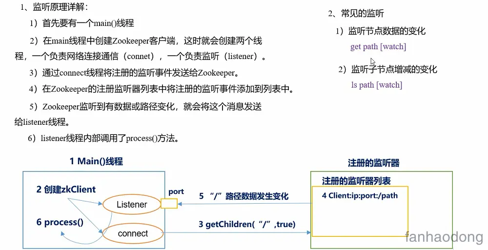 // 1. 注册到客户端监听器上(true),同时返回一个list 集合, 放着 子节点