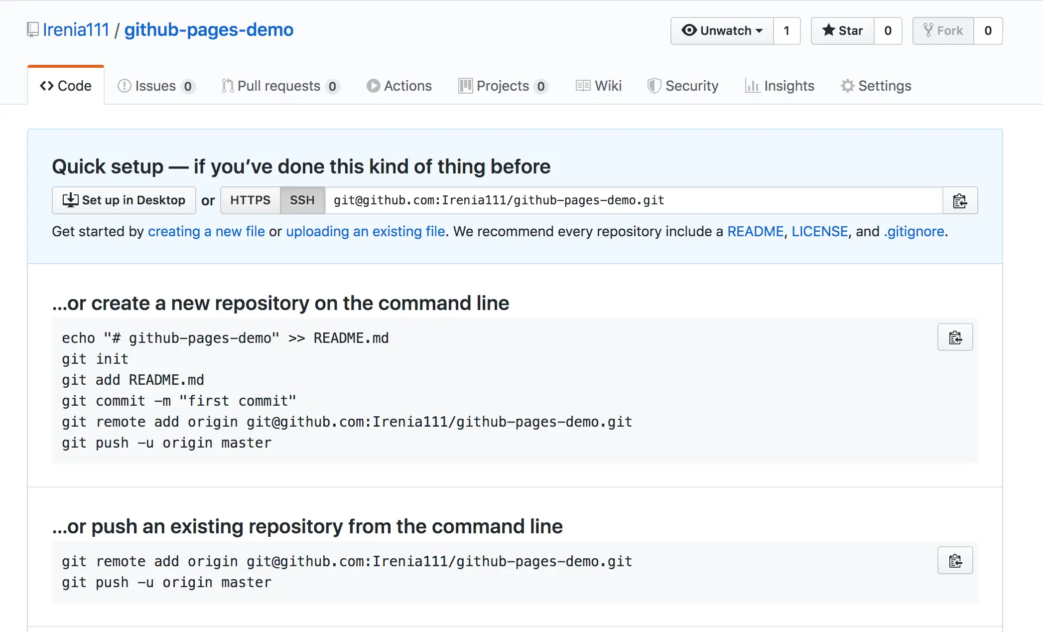 $ git remote add origin https://github.com/Irenia111/github-pages-demo.git$ git-pages-demo irenia$ git push -u origin master运行代码后会提示输入github的用户名及密码,文件上传结束后是这个样子: