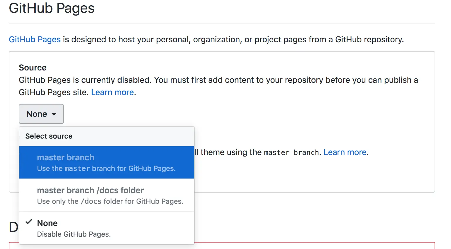 Github Pages选项, 将Source改为master branch,如果之前没有上传文件的话,你的本地git仓库和线上git仓库没有连接,无法选择master branch。