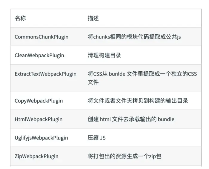 功能:作用于整个构建过程,可以理解为loader不能完成的事情,由plugins完成。 常用的plugins