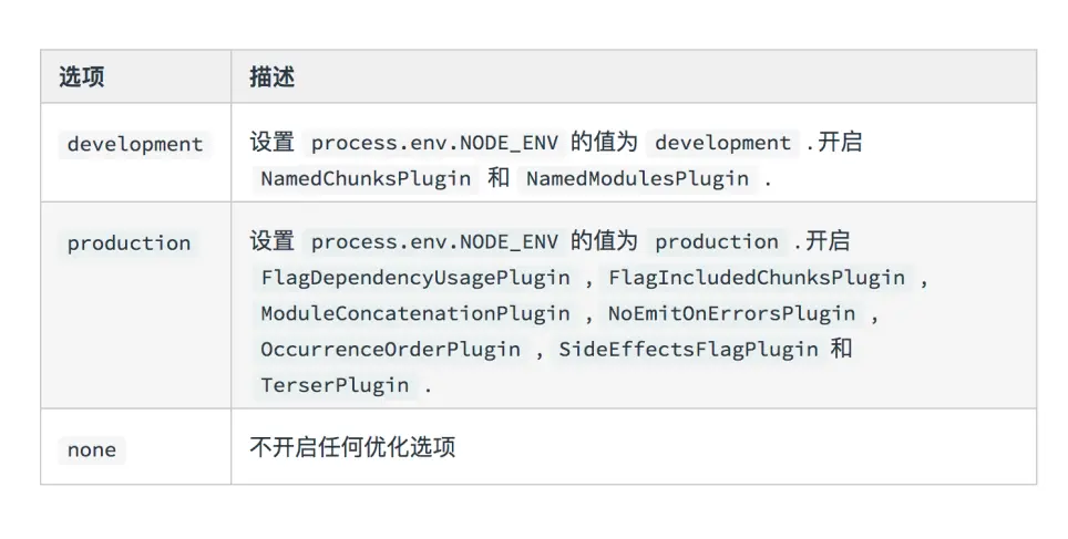 功能:用来指定当前的构建环境,webpack会根据当前的环境,开启一些配置。 参数:可以设置的值有production, development, none