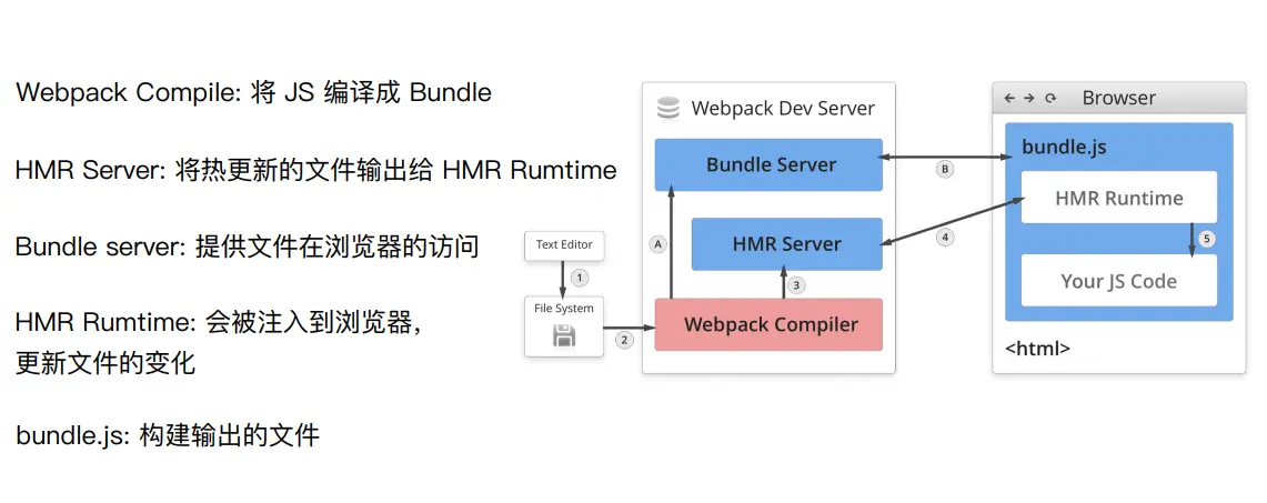 1—>2—>A—>B: 编译打包好的文件,经过bundle server,提供给浏览器,让浏览器能够以http://localhost来访问,也就是说bundle server相当于一个文件服务器。在这个阶段同时会把HMR Runtime注入到浏览器中,然后HMR Runtime跟HMR Server建立一个websocket的连接。