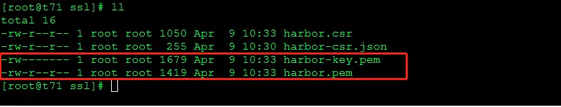 [root@t71 ssl]# cfssl gencert -ca=/k8s/kubernetes/ssl/ca.pem -ca-key=/k8s/kubernetes/ssl/ca-key.pem -config=/k8s/kubernetes/ssl/ca-config.json -profile=kubernetes harbor-csr.json | cfssljson -bare harbor