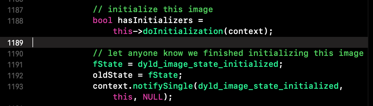 通过 link() 函数链接主程序和插入的库,链接完毕后还会进行 recursiveBind() 、弱绑定 weakBind() 。至此,dyld进行setContext、加载共享缓存、reloadAllImages、加载插入的库、链接主程序和插入的库已完成,加下来会进行初始化主程序的操作。