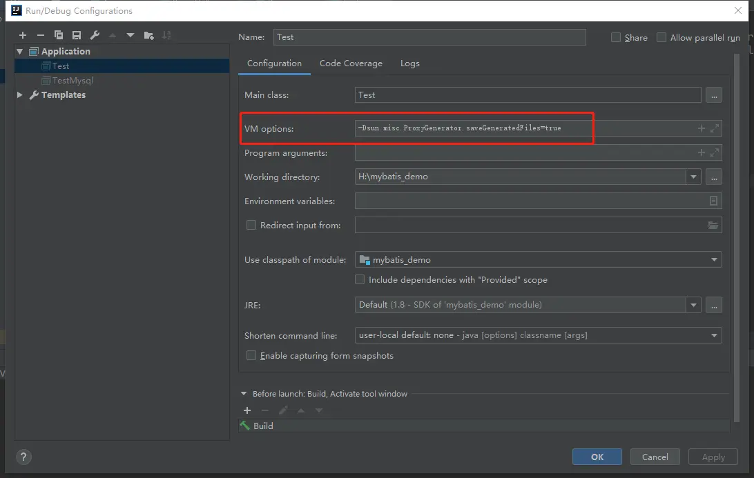 1,我们在运行Test类之前,首先进行一个配置,在红色框框的部分添加这个属性-Dsun.misc.ProxyGenerator.saveGeneratedFiles=true