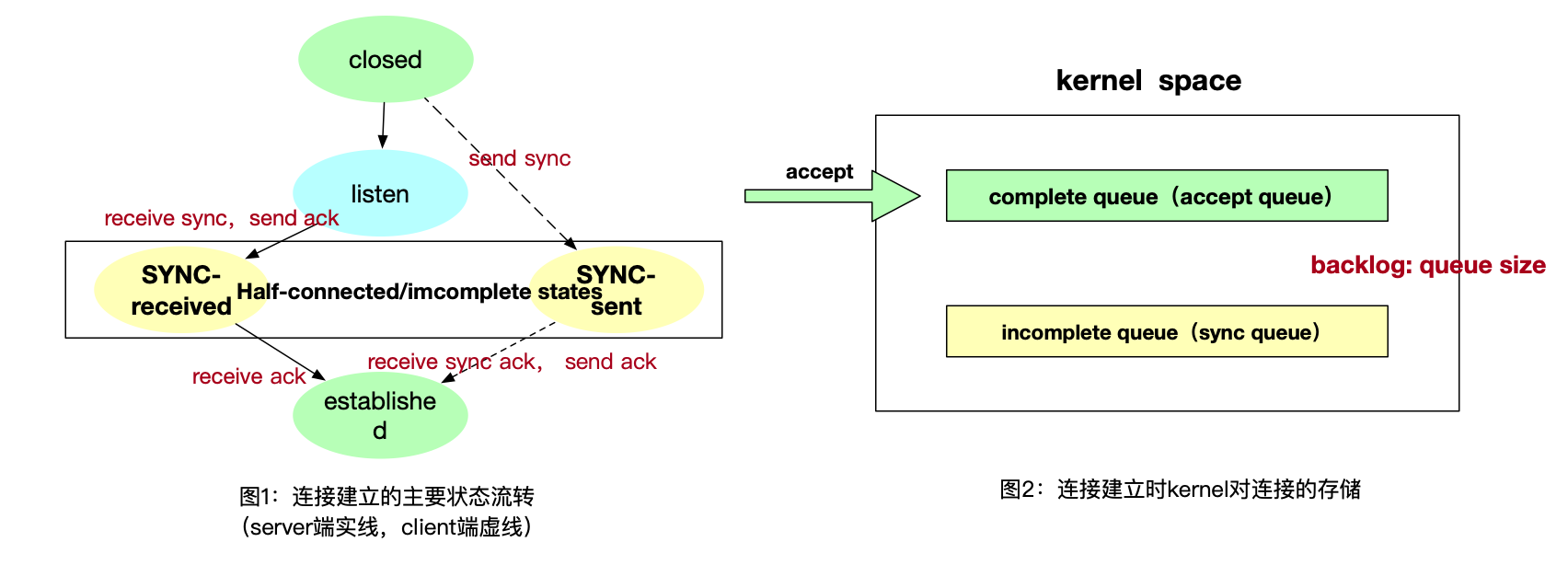 TCP连接的建立过程中,连接会处于中间状态,也就是图1中的黄色状态;accept是不能拿到这种连接的,TCP的连接建立时kernel负责而accept返回的是kernel建立好的连接(accept相关内容参考TCP三个角度这篇文章,有详细解释)。 所以kernel的具体实践者,无论是BSD还是linux,都采用了两个queue区分处于中间状态的,即图二中的两种queue,queue的名称直接对应了存放的连接状态和相关的动作,参考图不赘述。