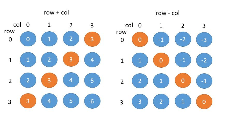 对于 row - col ,由于出现了负数,所以可以加 1 个 n,由 [ - 3, 3 ] 转换为 [ 1 , 7 ] 。