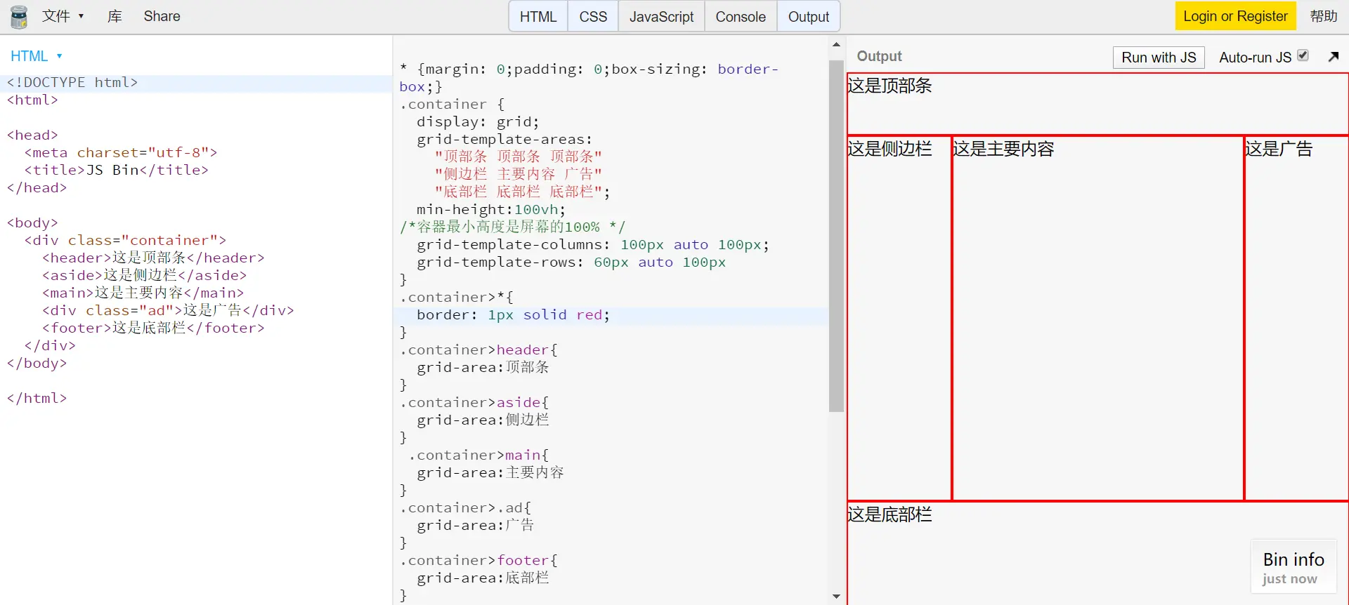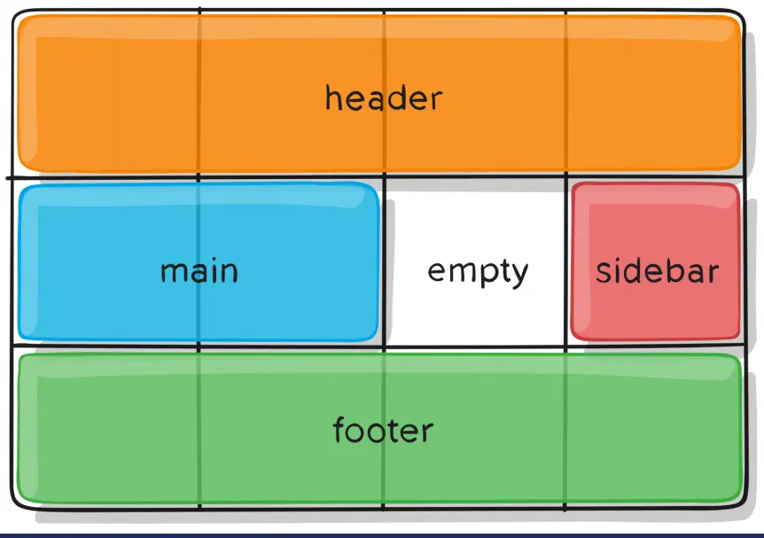 3、grid-template-areas指定哪块写什么元素,与grid-template-columns和grid-template-rows配合使用。