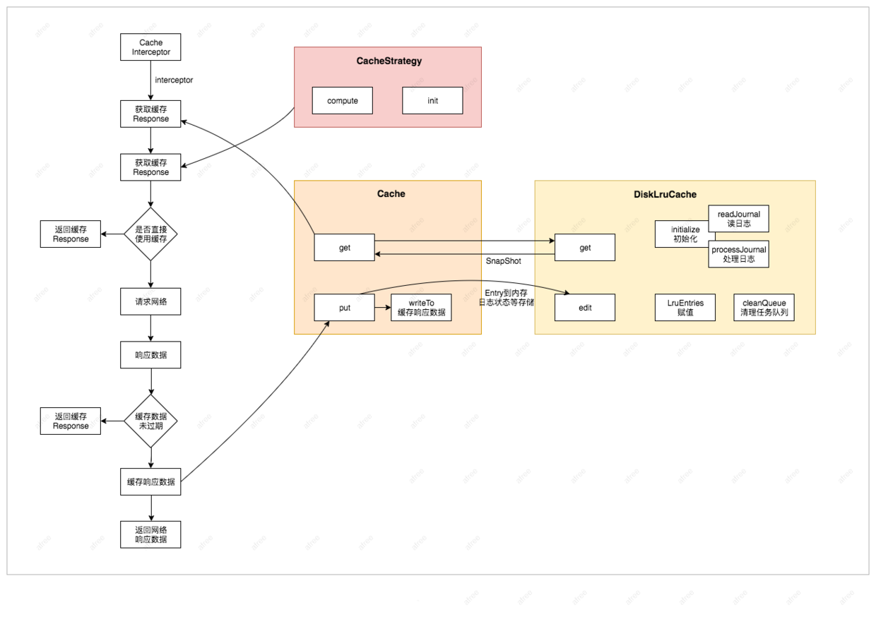 如果需要缓存机制,那么在构造OkHttpClient的时候需要传入一个Cache实例。 下面是OkHttp提供的一个CacheResponse的用例,除了传入一个Cache构造OkHttpClient,其它完全一样。 OkHttp实现缓存的切入点依旧是拦截器,之前的文章我们知道拦截器处理对象可以接受命令对象并根据自身情况选择处理还是不处理,所以接下来就是直接从CacheInterceptor开始分析