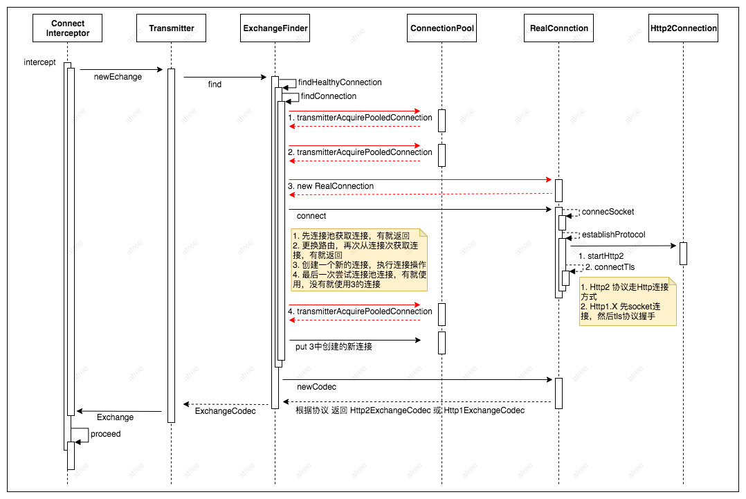 - 创建Exchange,它主要负责HTTP连接的维护管理及通知ExchangeCodec编码器进行实际的I/O操作