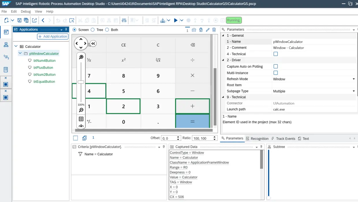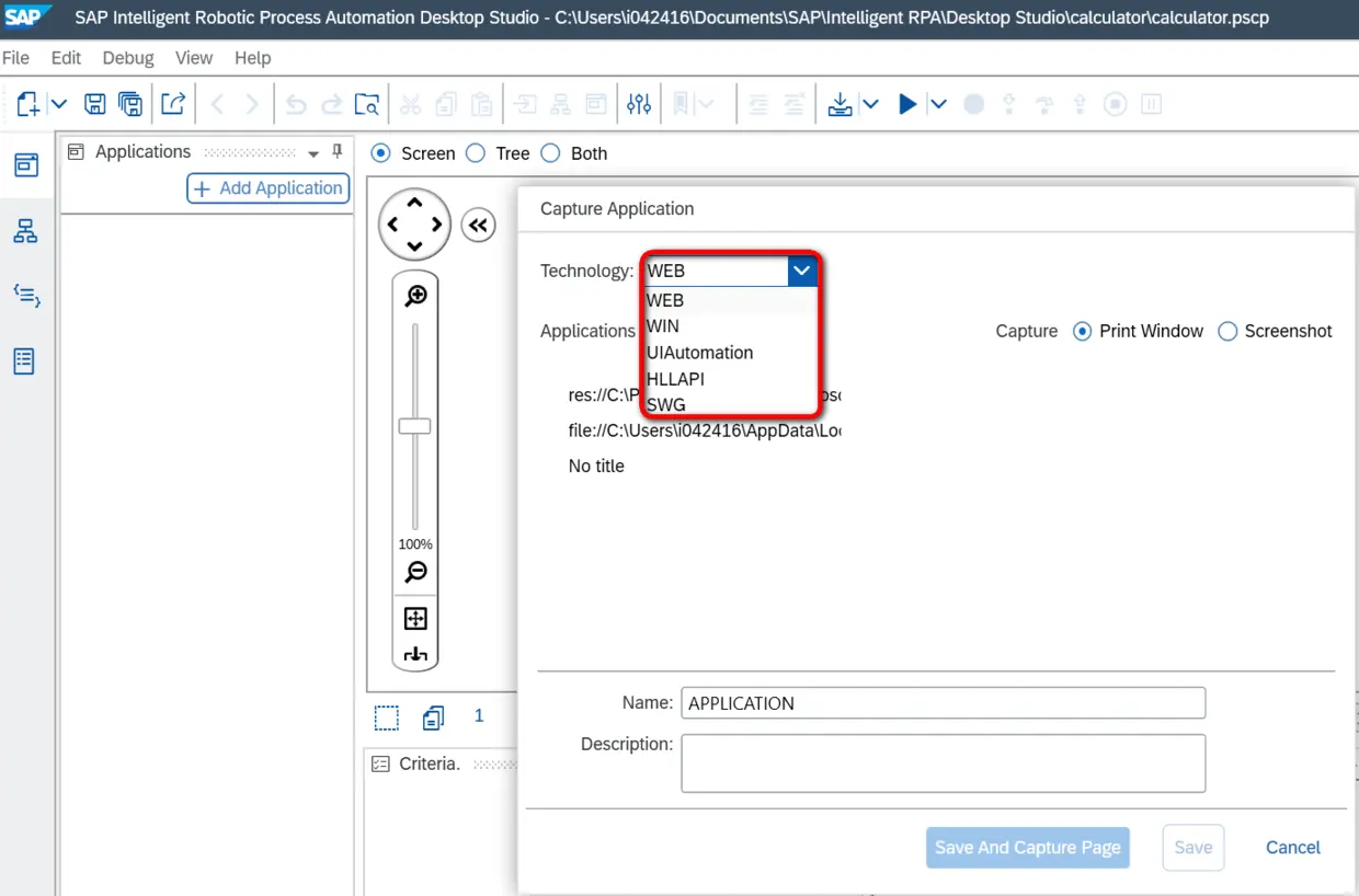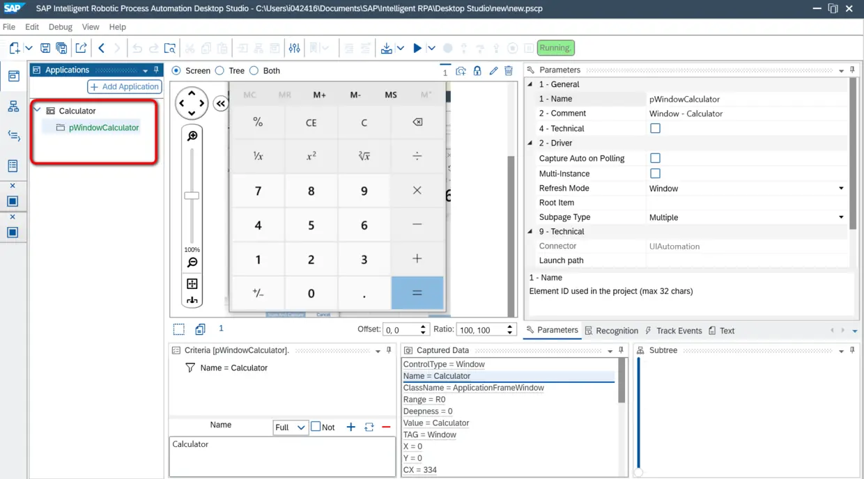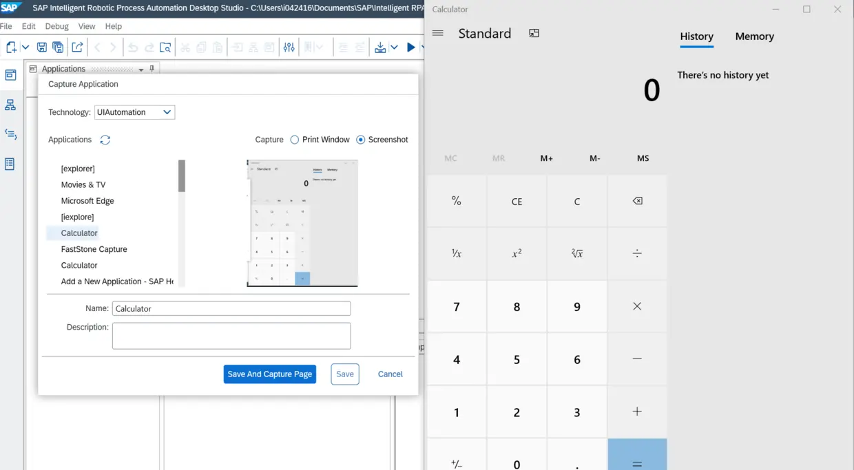 按住Ctrl键不放,把鼠标放到计算器应用上,SAP iRPA会智能的识别出这个计算器应用窗口的句柄:pWindowCalculator, 此时点击Scan And Capture: