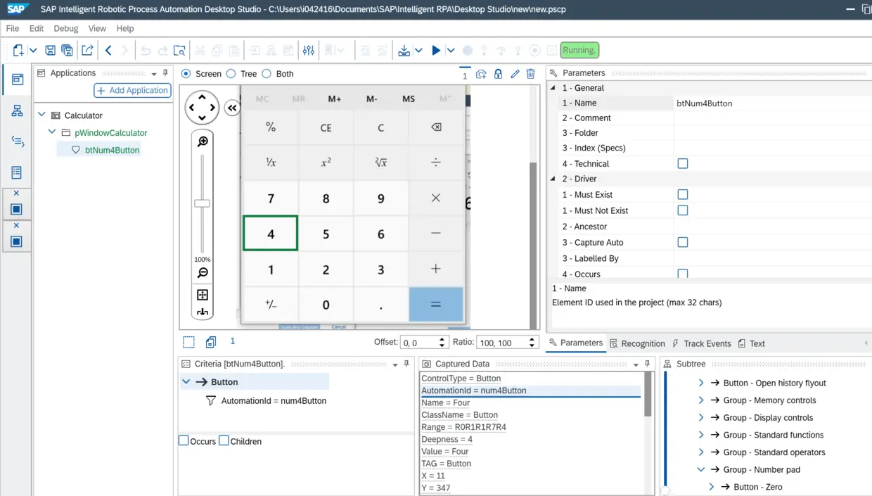 现在4这个按钮也出现在屏幕左边的树状结构里了,这代表4这个按钮也被我们标注为需要被SAP iRPA操作的UI元素了。