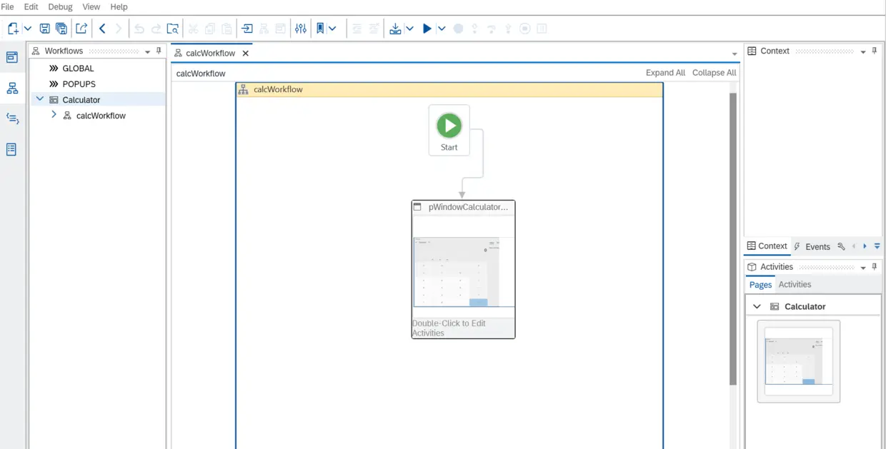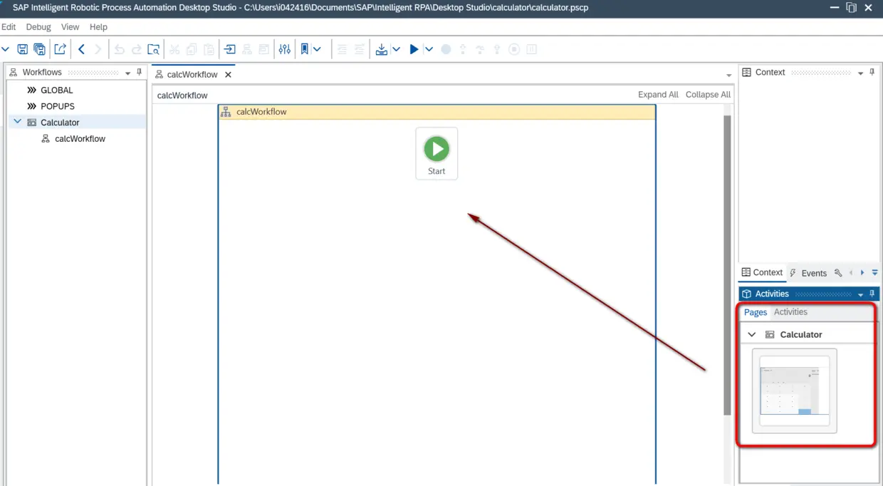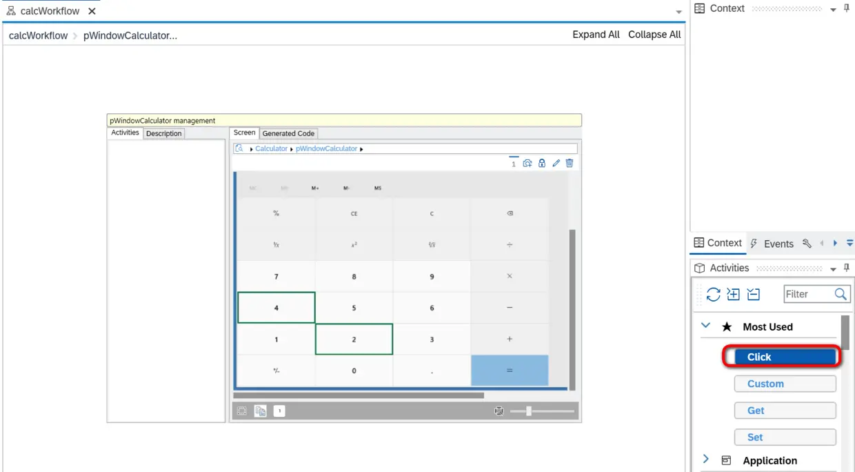 在工作流编辑页面的右边,有一个Activities面板,我们之前捕捉好的整个计算器应用就维护在内。把这个计算器应用的UI拖拽到工作流编辑页面里: