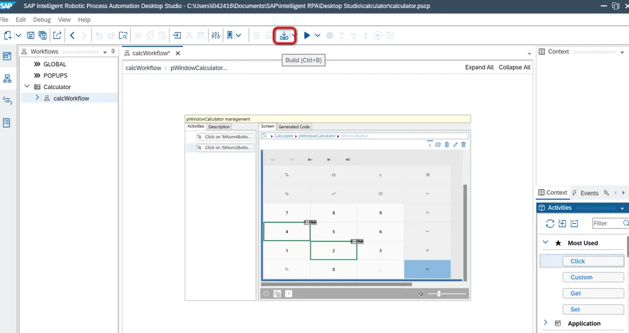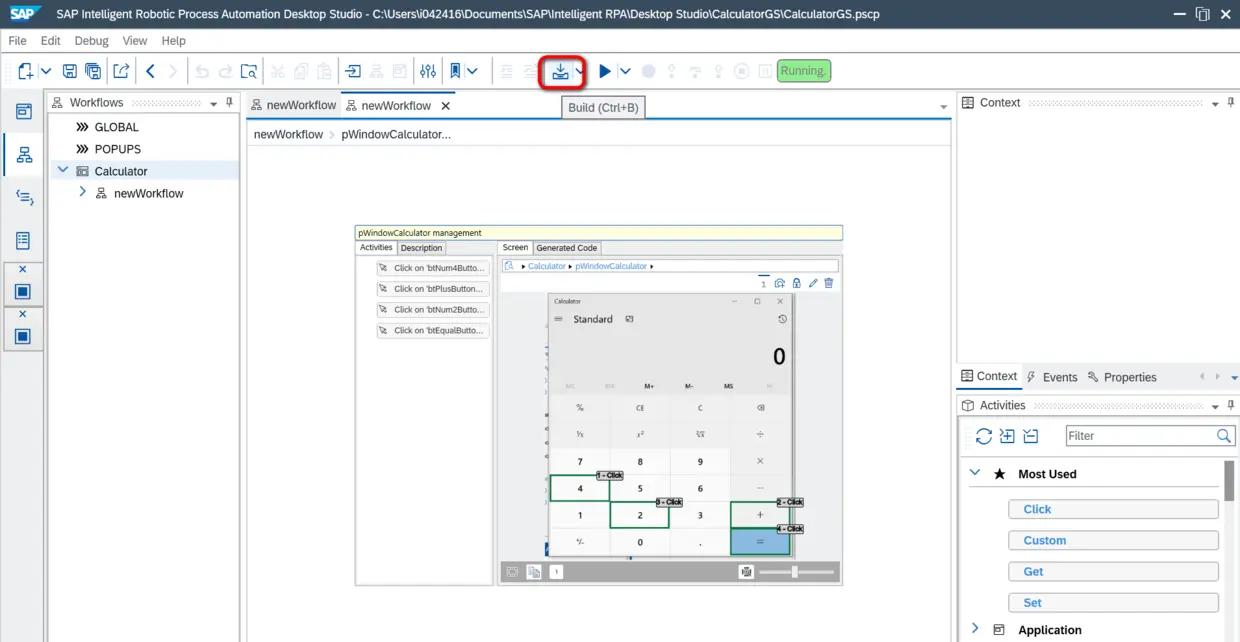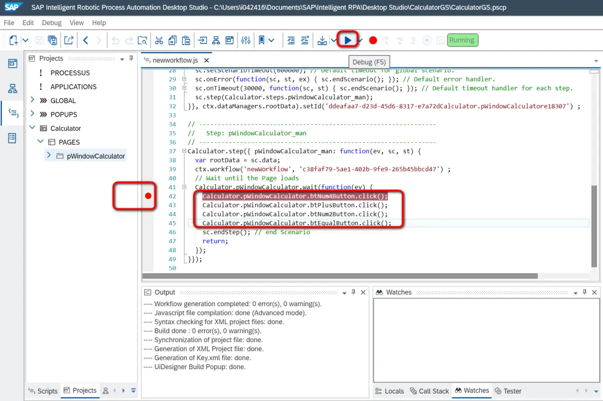 Build完成后,我们能看到自动生成的机器人脚本代码。正如侯捷老师所言,“源码面前,了无秘密”,通过阅读自动生成的JavaScript源代码,我们可以把SAP iRPA的工作原理同另一个流行的浏览器自动化测试框架Selenium做一个类比:二者都是定位到应用界面的某一元素后,调用元素对应的方法,而差异在于,Selenium通过web应用页面标签的ID来定位元素,而本例中的SAP iRPA通过UIAutomation来定位计算器应用的按钮。