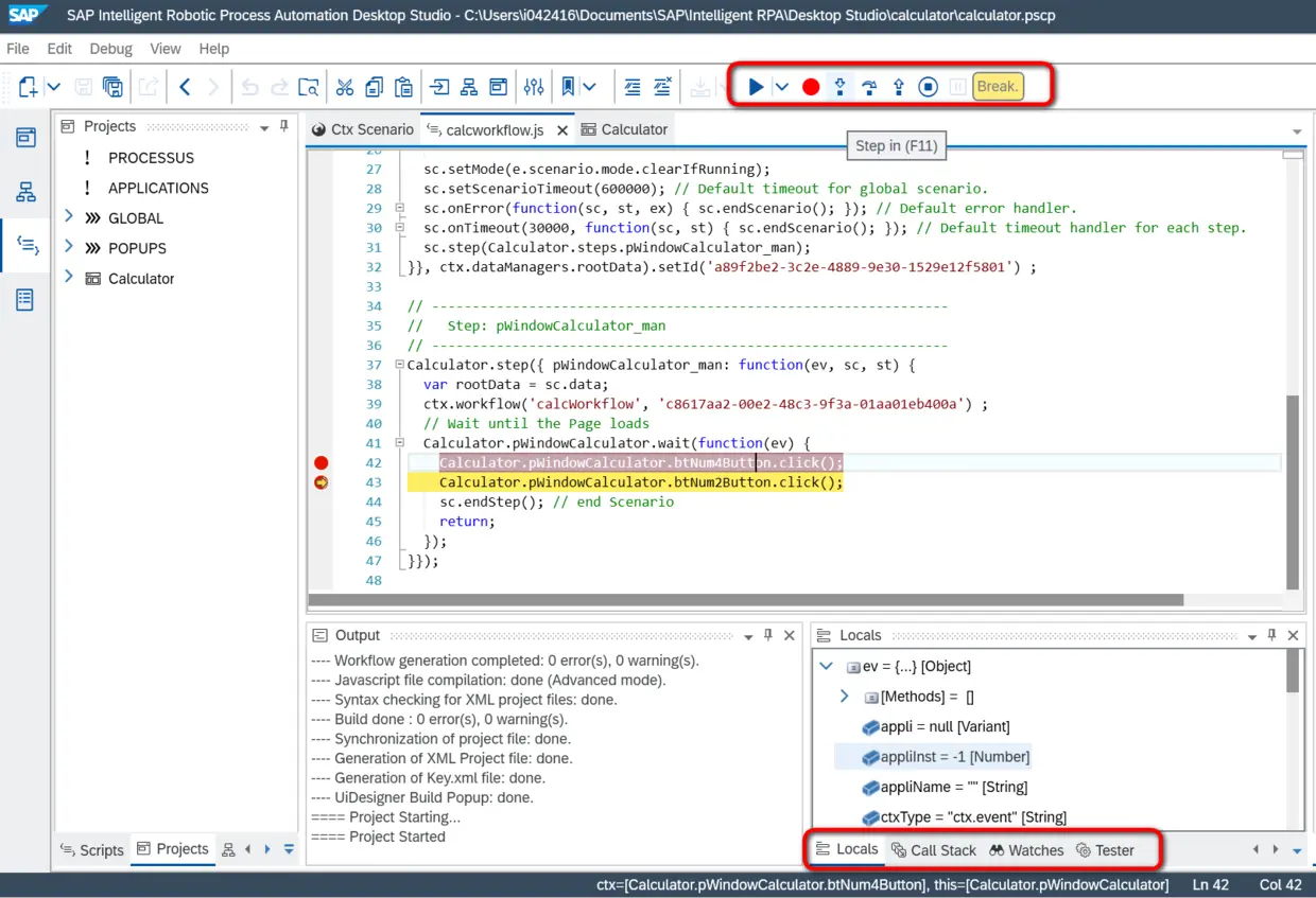 从上图看出,SAP iRPA自动生成的JavaScript脚本可以单步调试。点击Debug按钮,弹出了SAP iRPA调试器。
