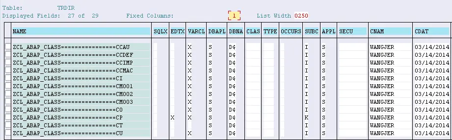 激活之后,在注册表TRDIR里根据类的名字ZCL_ABAP_CLASS进行查询,得到如下记录: