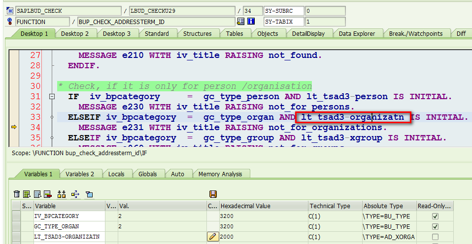 So I set a breakpoint in CRM validation module CRM_BUPA_MAIN_VAL mentioned in the error message, and found the error message is raised in line 34.