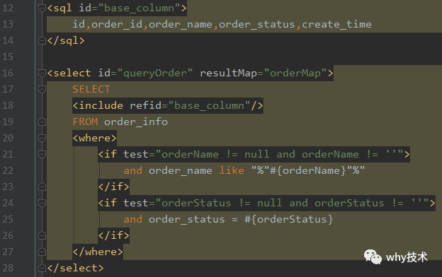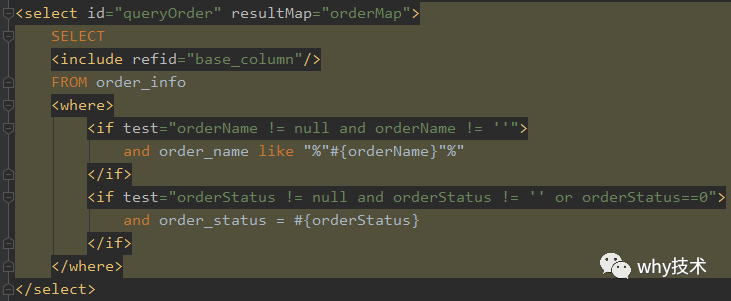 其中orderStatus!=null返回为true,orderStatus !=''返回为false,所以整个表达式返回为false,则不拼接这个if标签里面的sql。