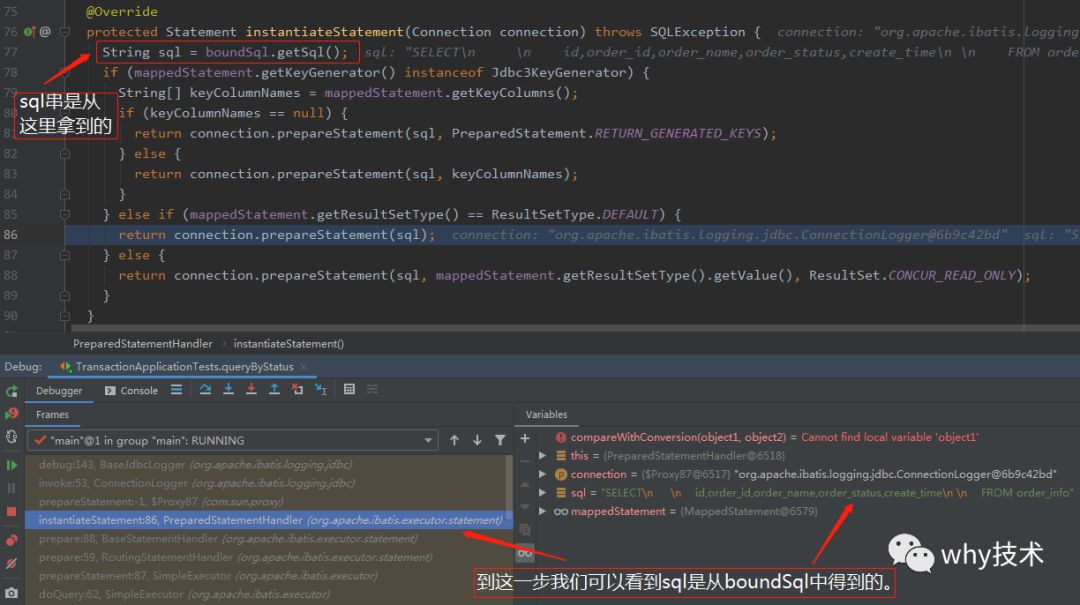 通过调用链,往后走三步,我们可以看到sql是从boundSql中获取到的: