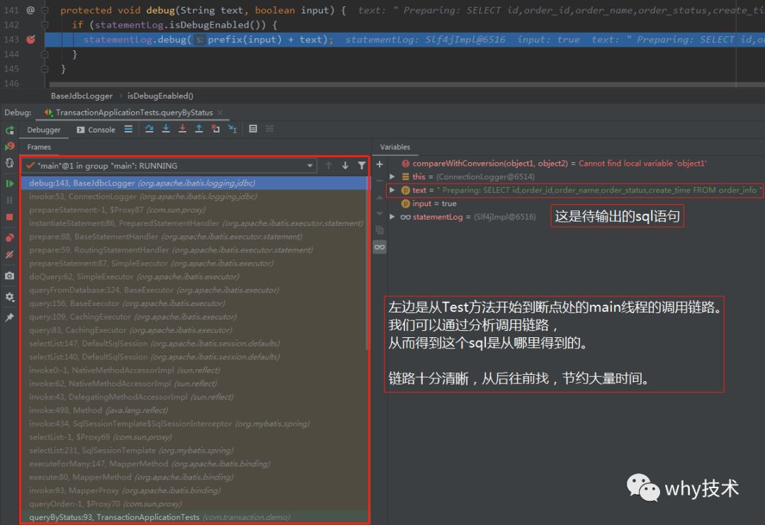 在org.apache.ibatis.logging.jdbc.BaseJdbcLogger的143行,debug方法中打印了日志,这行日志就是我的突破口。