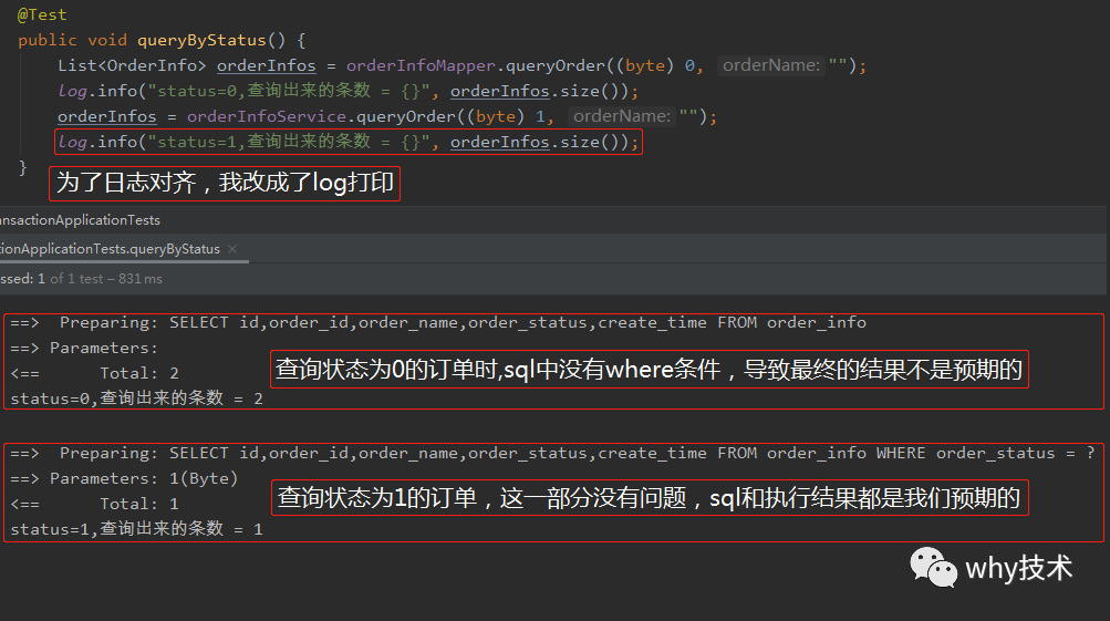 加上sql打印后,我们发现当status为0时,mybatis并没有给我们拼接where关键字。