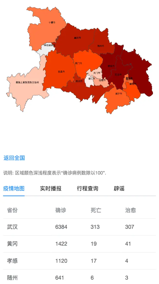 丁香医生等平台提供的疫情地图, 用的是分段函数划分的严重等级, 这样模糊了一些区别.