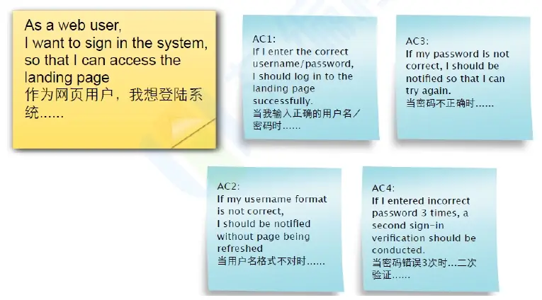 为用户的每个需求编一个故事,例:作为【用户角色】,我想【实现一个结果】,因为【商业价值】;每一个用户故事都是从“为什么”开始,使用简单的书面描述,定义一小片用户可以评估、验证的功能。