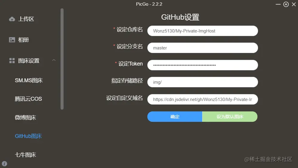 输入自己的 GitHub 仓库名、分支名写 master 、Token、存储路径就写 img/ 就行了。